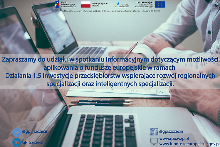 Główny Punkt Informacyjny Funduszy Europejskich w Szczecinie wraz z Wydziałem Wdrażania Regionalnego Programu Operacyjnego serdecznie zapraszają na bezpłatne spotkanie informacyjne dla przedsiębiorstw zakładające rozwój innowacyjności i konkurencyjności przemysłu stoczniowego firm w ramach Działania 1.5 Inwestycje przedsiębiorstw wspierające rozwój regionalnych specjalizacji oraz inteligentnych specjalizacji, które odbędzie się 13 grudnia 2019 r., w godz. 9:00-12:30 w siedzibie Wydziału Wdrażania Regionalnego Programu Operacyjnego Województwa Zachodniopomorskiego, 70-203 Szczecin, ul. Wyszyńskiego 30, sala konferencyjna nr 308.