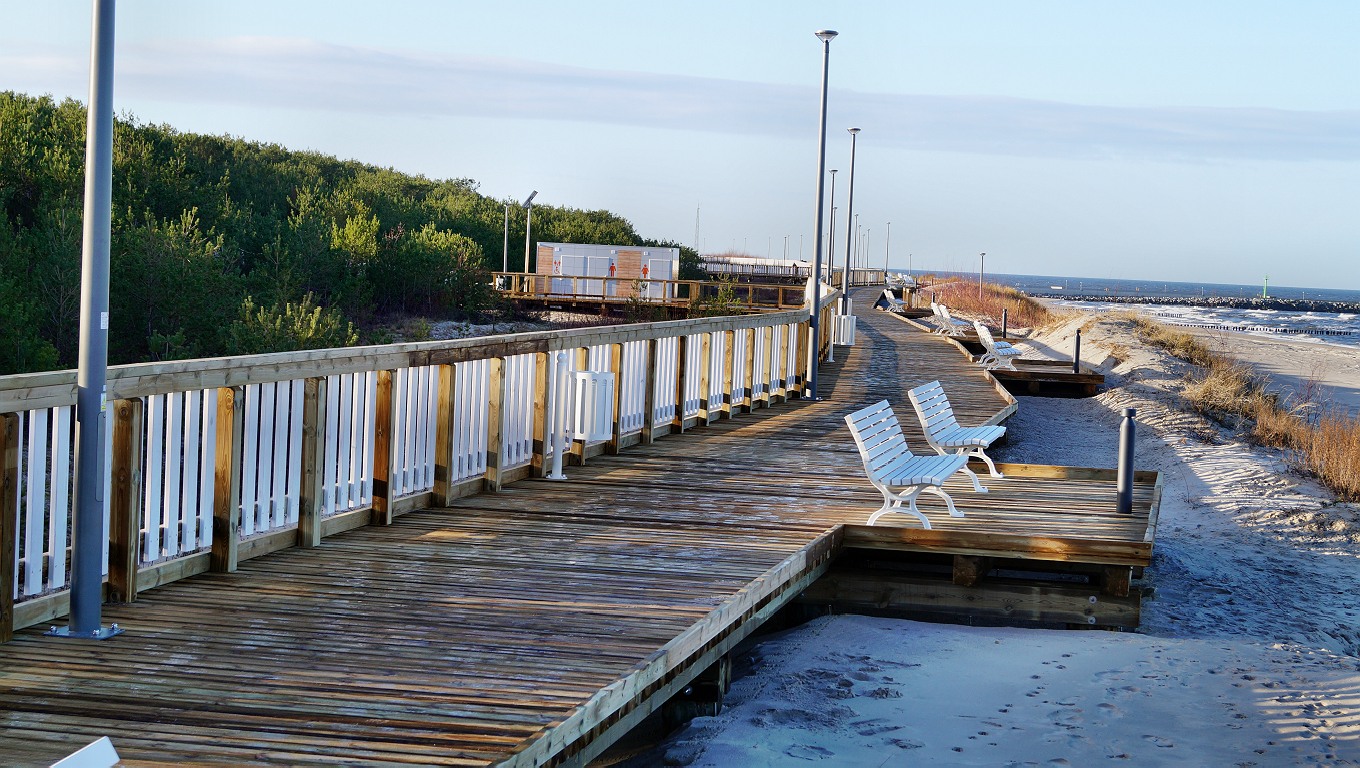 Promenada posiada drewniane ogrodzenie, oświetlenie i toalety dla zwiedzających. Przy ulicy Osiedle Rybackie wykonane zostało zejście na plażę w formie pochylni, a przy ulicy Rybackiej oprócz miejsca umożliwiającego dostęp do plaży, zmodyfikowana została skarpa.