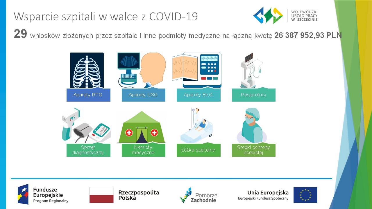 Środki dla opieki medycznej oraz ratownictwa medycznego zostały uruchomione z działania 7.7. Regionalnego Programu Operacyjnego Województwa Zachodniopomorskiego 2014-2020 obejmującego przedsięwzięcia związane z walką i zapobieganiem COVID-19. Za obsługę naboru wniosków odpowiadał Wojewódzki Urząd Pracy w Szczecinie (instytucji  odpowiada za zarządzanie środkami Europejskiego Funduszu Społecznego w regionie). Obecnie placówki przystępują do zawierania umów, umożliwiających przekazanie niezbędnego dofinansowania.