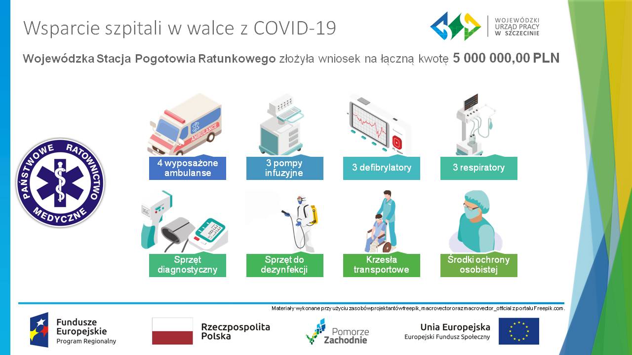Na walkę z COVID-19 Samorząd Województwa przeznacza kwotę blisko 31,5 mln w ramach Zachodniopomorskiego Pakietu Antykryzysowego. Środki te trafią do szpitali wojewódzkich, powiatowych, resortowych i klinicznych oraz ratownictwa medycznego. Sam projekt Wojewódzkiej Stacji Pogotowia Ratunkowego opiewa na 5 mln zł. Dzięki temu wsparciu WSPR zakupi m.in. cztery ambulanse, respiratory czy  defibratory.